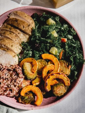 This roasted squash harvest bowl is the perfect fall chicken bowl. It’s made with delicata squash, wild rice, a kale salad, and a maple...