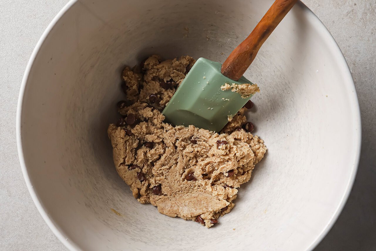 - Pour the vanilla extract, maple syrup, and coconut oil into the batter. Stir well to combine. Fold in the chocolate chips and salt until fully incorporated.