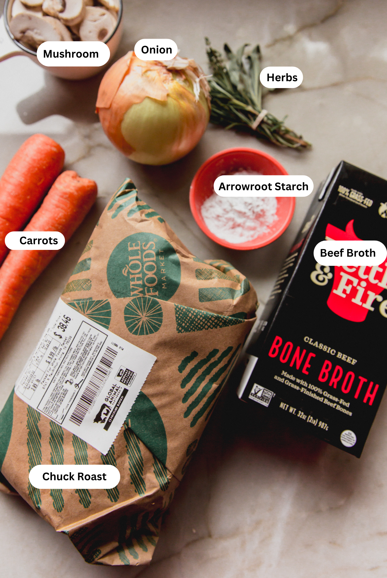 - Carrots, mushrooms, onion, and garlic. Be sure to cut the carrots and mushrooms into thick pieces as they’ll be cooked for a long time in the oven.