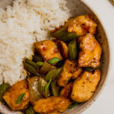 Reduce the heat to low and add the vegetables back to the pan along with the sauce. Allow the sauce to simmer and thicken. The chicken should be cooked through and the sauce should be thick. Stir to coat the chicken and vegetables in the sauce.