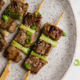 Once the steak is done marinating, begin layering the skewers with green onion pieces between each piece of beef. Repeat until all of the meat is skewered.