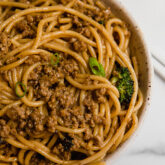 Add the ground beef back to the pan along with the broccoli and cooked spaghetti and stir well to coat with the sauce.