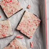 Pour the coconut butter layer over the chocolate. Lightly tip the pan to evenly spread the coconut butter. Top with crushed candy canes or pomegranate seeds and transfer to the fridge to harden for 1-2 hours.