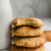 Roll the dough into 7-8 small balls. Roll each ball in the cinnamon-sugar mixture until lightly coated. Add the dough balls to the baking sheet and use your hand to lightly press down into cookies, making sure that the cookies are evenly spaced.