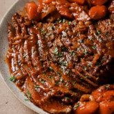 If you don't have a large casserole dish, you can sear the brisket in a pan and roast it in a covered baking dish or roasting pan.To make this brisket AIP, omit the black pepper and use nightshade-free tomato sauce. If using a whole brisket, add 30 minutes to the cook time as needed until the brisket is cooked through.All nutritional information are estimations and will vary. Estimations do not include optional ingredients.