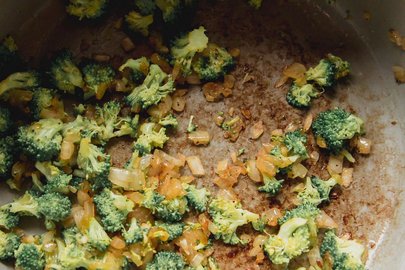 - Use a large, deep pot heat the avocado oil over medium heat. Once the oil is shimmering, add the onion and garlic and saute for 3-4 minutes or until lightly translucent. Add the broccoli and saute for another 3-4 minutes or until the broccoli is lightly soft and bright green. Season with salt and pepper.